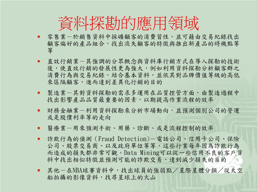 資料探勘的應用領域 • 零售業-於銷售資料中採礦顧客的消費習性,並可藉由交易紀錄找出顧客偏好的產品組合,找出流失顧客的特徵與推出新產品的時機點等等 • 直效行銷業-其強調的分眾概念與資料庫行銷方式在導入探勘的技術後,使直效行銷的發展性更為強大,例如利用資料探勘分析顧客群之消費行為與交易紀錄,結合基本資料,並依其對品牌價值等級的高低來區隔顧客,進而達到差異化行銷的目的 • 製造業-其對資料探勘的需求多運用在品質控管方面,由製造過程中找出影響產品品質最重要的因素,以期提高作業流程的效率 • 財務金融業-利用資料探勘來分析市場動向,並預測個別公司的營運或是股價利率等的走向 • 醫療業-用來預測手術、用藥、診斷、或是流程控制的效率 • 詐欺行為的偵測(Fraud Detection)-電話公司、信用卡公司、保險公司、股票交易商、以及政府單位等等,這些行業每年因為詐欺行為而造成的損失都非常可觀。Data Mining可以從一些信用不良的客戶資料中找出相似特徵並預測可能的詐欺交易,達到減少損失的目的 • 其他-在NBA球賽資料中,找出球員的強弱點/星際星體分類/從太空船拍攝的影像資料,找尋星球上的火山