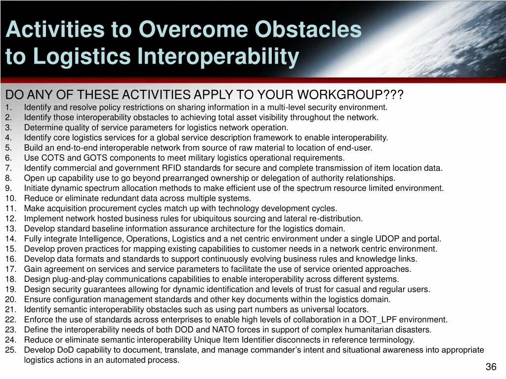 Activities to Overcome Obstacles to Logistics Interoperability • DO ANY OF THESE ACTIVITIES APPLY TO YOUR WORKGROUP??? • Identify and resolve policy restrictions on sharing information in a multi-level security environment. • Identify those interoperability obstacles to achieving total asset visibility throughout the network. • Determine quality of service parameters for logistics network operation. • Identify core logistics services for a global service description framework to enable interoperability. • Build an end-to-end interoperable network from source of raw material to location of end-user. • Use COTS and GOTS components to meet military logistics operational requirements. • Identify commercial and government RFID standards for secure and complete transmission of item location data. • Open up capability use to go beyond prearranged ownership or delegation of authority relationships. • Initiate dynamic spectrum allocation methods to make efficient use of the spectrum resource limited environment. • Reduce or eliminate redundant data across multiple systems. • Make acquisition procurement cycles match up with technology development cycles. • Implement network hosted business rules for ubiquitous sourcing and lateral re-distribution. • Develop standard baseline information assurance architecture for the logistics domain. • Fully integrate Intelligence, Operations, Logistics and a net centric environment under a single UDOP and portal. • Develop proven practices for mapping existing capabilities to customer needs in a network centric environment. • Develop data formats and standards to support continuously evolving business rules and knowledge links. • Gain agreement on services and service parameters to facilitate the use of service oriented approaches. • Design plug-and-play communications capabilities to enable interoperability across different systems. • Design security guarantees allowing for dynamic identification and levels of trust for casual and regular users. • Ensure configuration management standards and other key documents within the logistics domain. • Identify semantic interoperability obstacles such as using part numbers as universal locators. • Enforce the use of standards across enterprises to enable high levels of collaboration in a DOT_LPF environment. • Define the interoperability needs of both DOD and NATO forces in support of complex humanitarian disasters. • Reduce or eliminate semantic interoperability Unique Item Identifier disconnects in reference terminology. • Develop DoD capability to document, translate, and manage commander’s intent and situational awareness into appropriate logistics actions in an automated process.