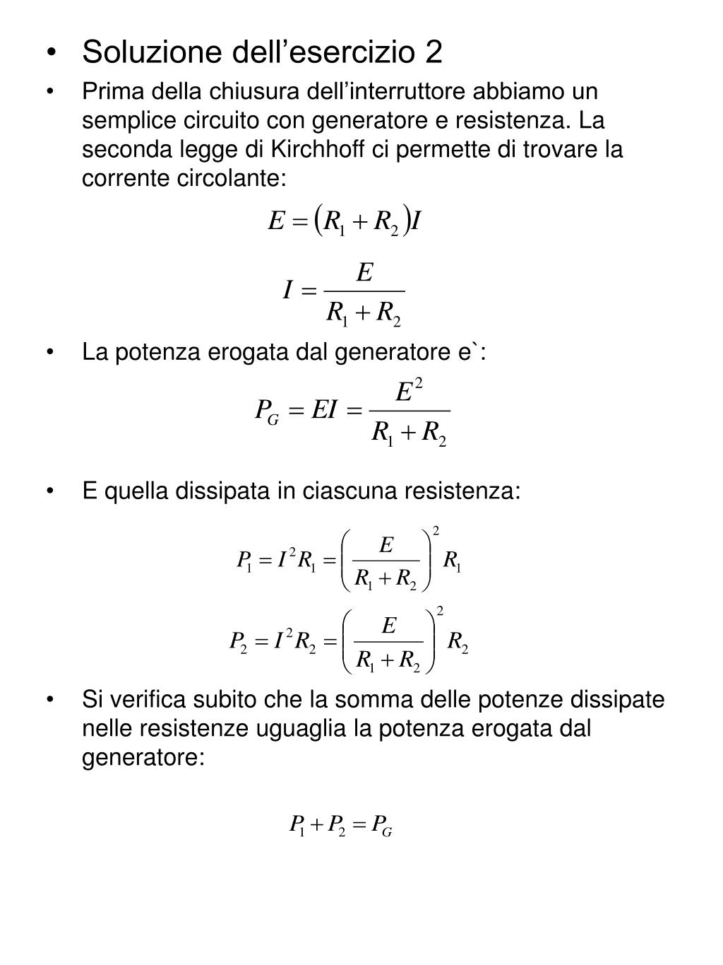 Soluzione dell’esercizio 2 • Prima della chiusura dell’interruttore abbiamo un semplice circuito con generatore e resistenza. La seconda legge di Kirchhoff ci permette di trovare la corrente circolante: • La potenza erogata dal generatore e`: • E quella dissipata in ciascuna resistenza: • Si verifica subito che la somma delle potenze dissipate nelle resistenze uguaglia la potenza erogata dal generatore:
