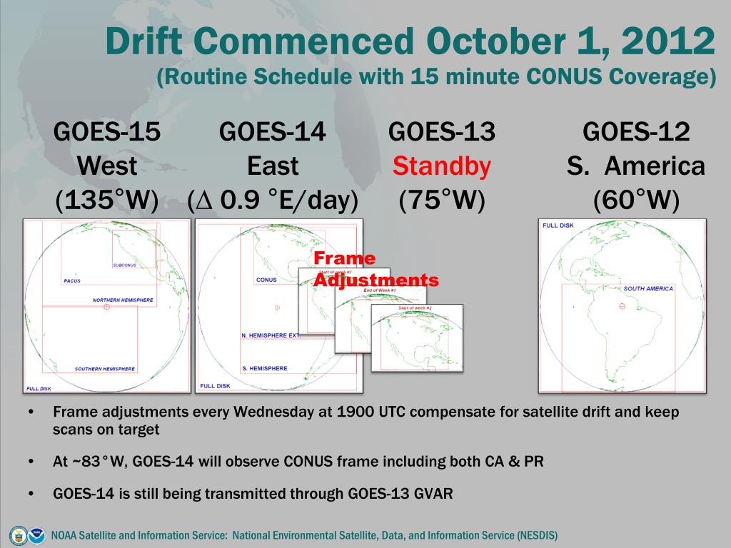 Drift Commenced October 1, 2012(Routine Schedule with 15 minute CONUS Coverage) GOES-15 West (135°W) GOES-14 East (∆ 0.9 °E/day) GOES-13 Standby (75°W) GOES-12 S. America (60°W) • Frame adjustments every Wednesday at 1900 UTC compensate for satellite drift and keep scans on target • At ~83°W, GOES-14 will observe CONUS frame including both CA & PR • GOES-14 is still being transmitted through GOES-13 GVAR Frame Adjustments NOAA Satellite and Information Service: National Environmental Satellite, Data, and Information Service (NESDIS)