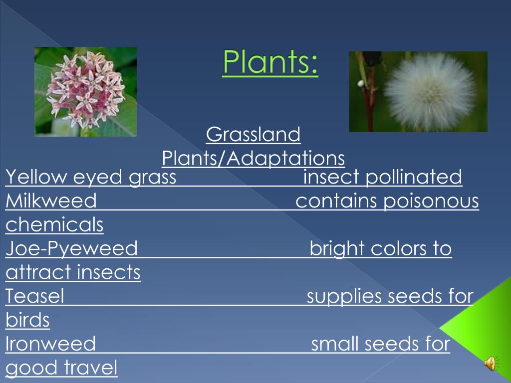 Plants: Grassland Plants/Adaptations Yellow eyed grass insect pollinated Milkweed contains poisonous chemicals Joe-Pyeweed bright colors to attract insects Teasel supplies seeds for birds Ironweed small seeds for good travel