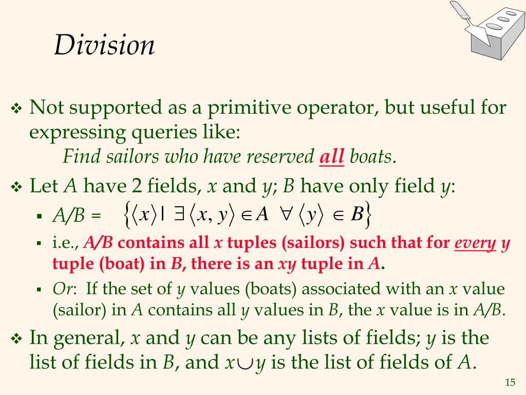 Division • Not supported as a primitive operator, but useful for expressing queries like: Find sailors who have reserved allboats. • Let A have 2 fields, x and y; B have only field y: • A/B = • i.e., A/B contains all x tuples (sailors) such that for everyy tuple (boat) in B, there is an xy tuple in A. • Or: If the set of y values (boats) associated with an x value (sailor) in A contains all y values in B, the x value is in A/B. • In general, x and y can be any lists of fields; y is the list of fields in B, and x y is the list of fields of A.