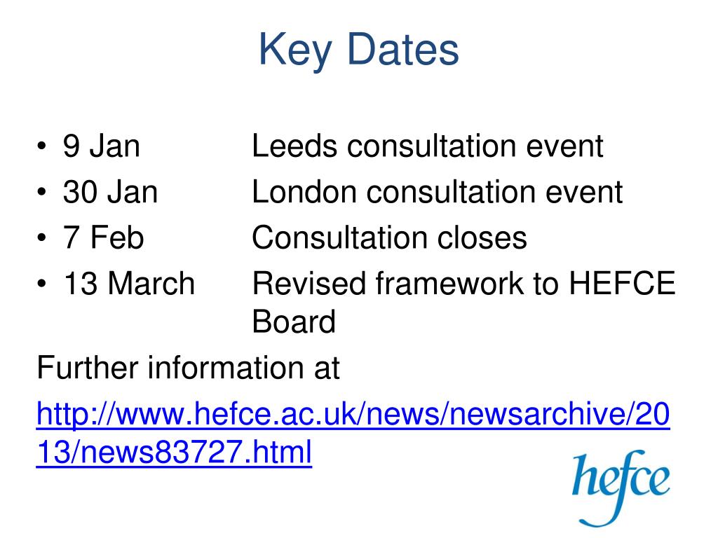 Key Dates • 9 Jan Leeds consultation event • 30 Jan London consultation event • 7 Feb Consultation closes • 13 March Revised framework to HEFCE Board Further information at http://www.hefce.ac.uk/news/newsarchive/2013/news83727.html