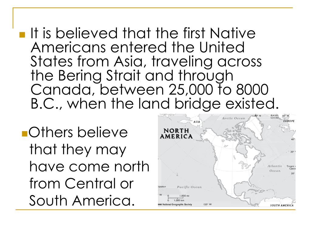 It is believed that the first Native Americans entered the United States from Asia, traveling across the Bering Strait and through Canada, between 25,000 to 8000 B.C., when the land bridge existed. • Others believe that they may have come north from Central or South America.