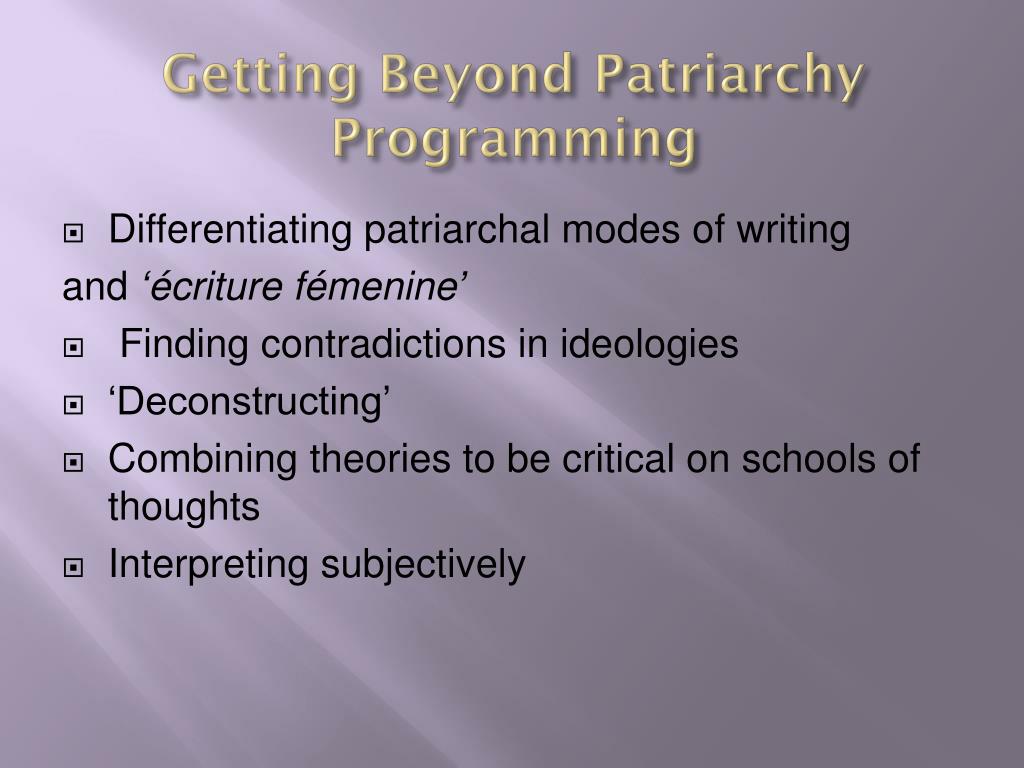 Getting Beyond Patriarchy Programming • Differentiating patriarchal modes of writing and ‘écriturefémenine’ • Finding contradictions in ideologies • ‘Deconstructing’ • Combining theories to be critical on schools of thoughts • Interpreting subjectively