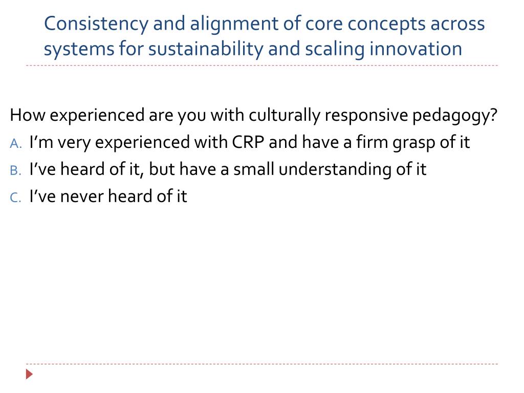 Consistency and alignment of core concepts across systems for sustainability and scaling innovation How experienced are you with culturally responsive pedagogy? • I’m very experienced with CRP and have a firm grasp of it • I’ve heard of it, but have a small understanding of it • I’ve never heard of it