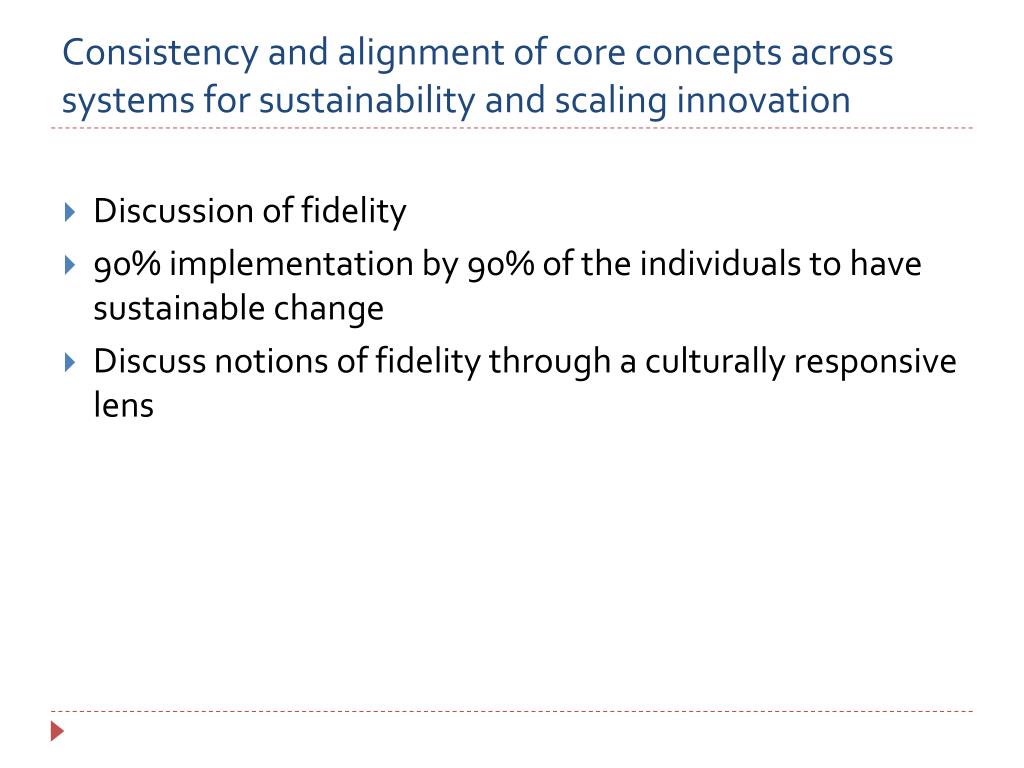 Consistency and alignment of core concepts across systems for sustainability and scaling innovation • Discussion of fidelity • 90% implementation by 90% of the individuals to have sustainable change • Discuss notions of fidelity through a culturally responsive lens