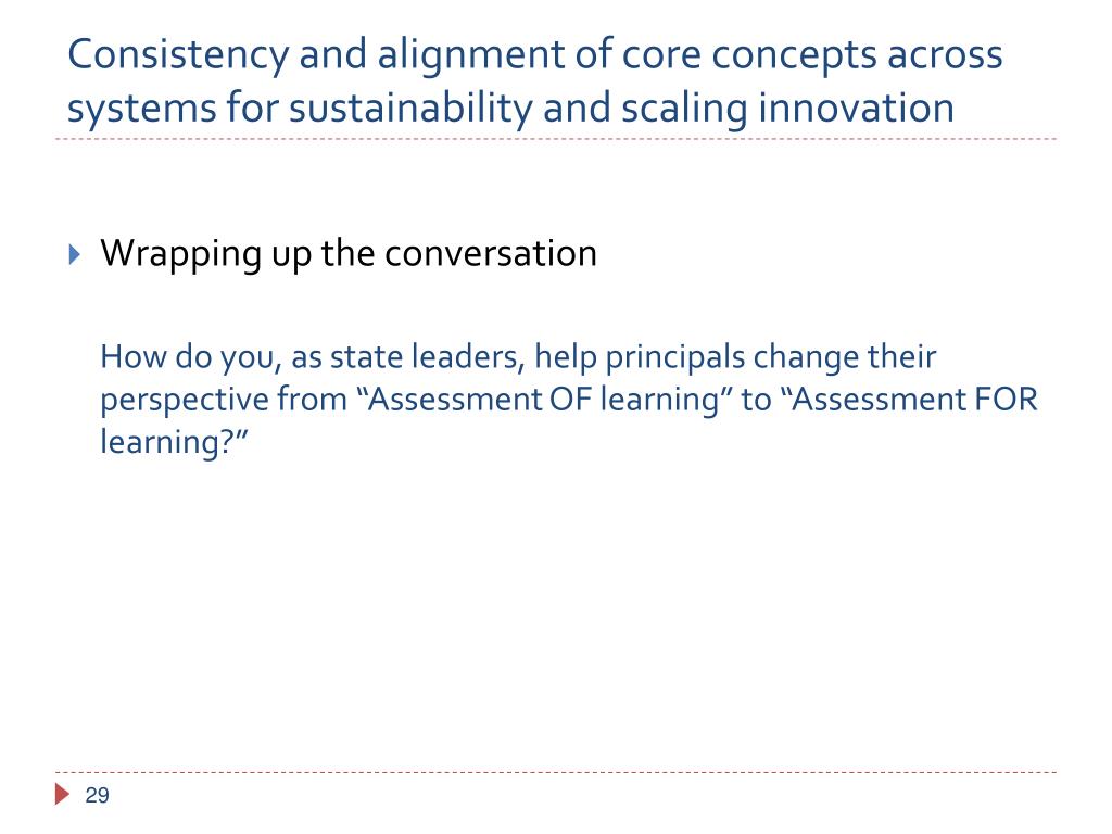 Consistency and alignment of core concepts across systems for sustainability and scaling innovation • Wrapping up the conversation How do you, as state leaders, help principals change their perspective from “Assessment OF learning” to “Assessment FOR learning?” 29