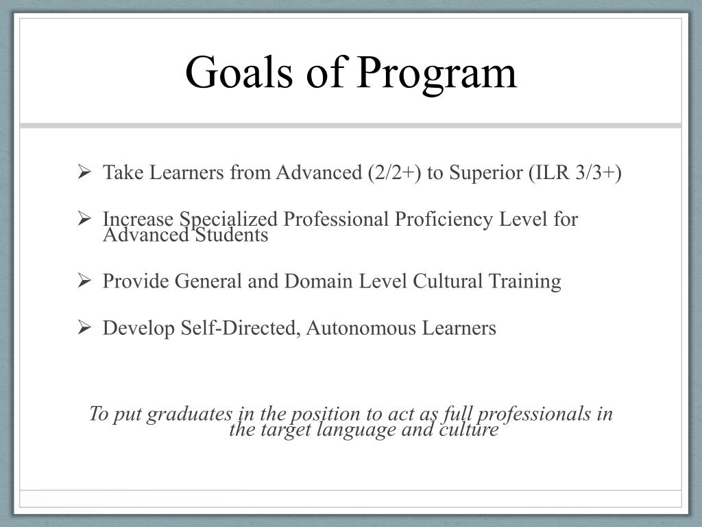 Goals of Program • Take Learners from Advanced (2/2+) to Superior (ILR 3/3+) • Increase Specialized Professional Proficiency Level for Advanced Students • Provide General and Domain Level Cultural Training • Develop Self-Directed, Autonomous Learners To put graduates in the position to act as full professionals in the target language and culture
