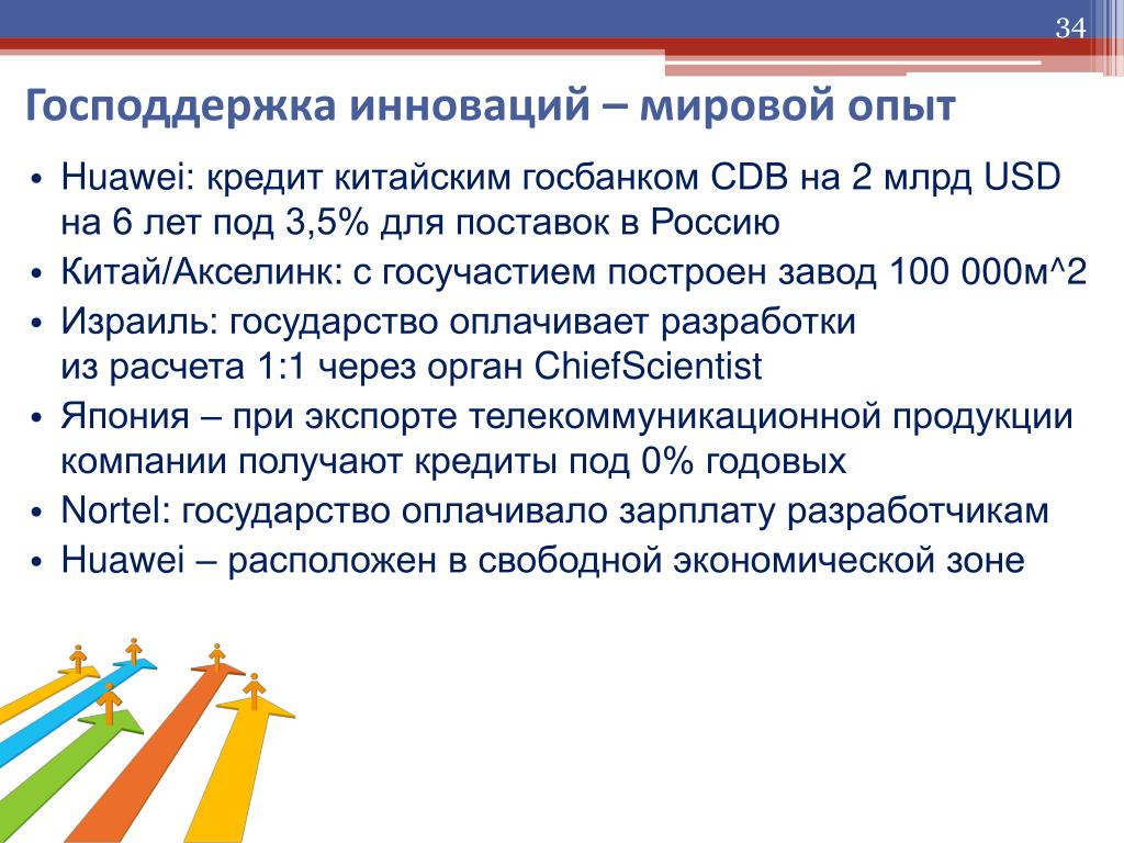 Господдержка инноваций – мировой опыт • Huawei: кредит китайским госбанком CDB на 2млрд USD на 6 лет под 3,5% для поставок в Россию • Китай/Акселинк: с госучастиемпостроен завод 100000м^2 • Израиль: государство оплачивает разработкииз расчета 1:1 через орган ChiefScientist • Япония – при экспорте телекоммуникационной продукции компании получают кредиты под 0% годовых • Nortel: государство оплачивало зарплату разработчикам • Huawei – расположен в свободной экономической зоне