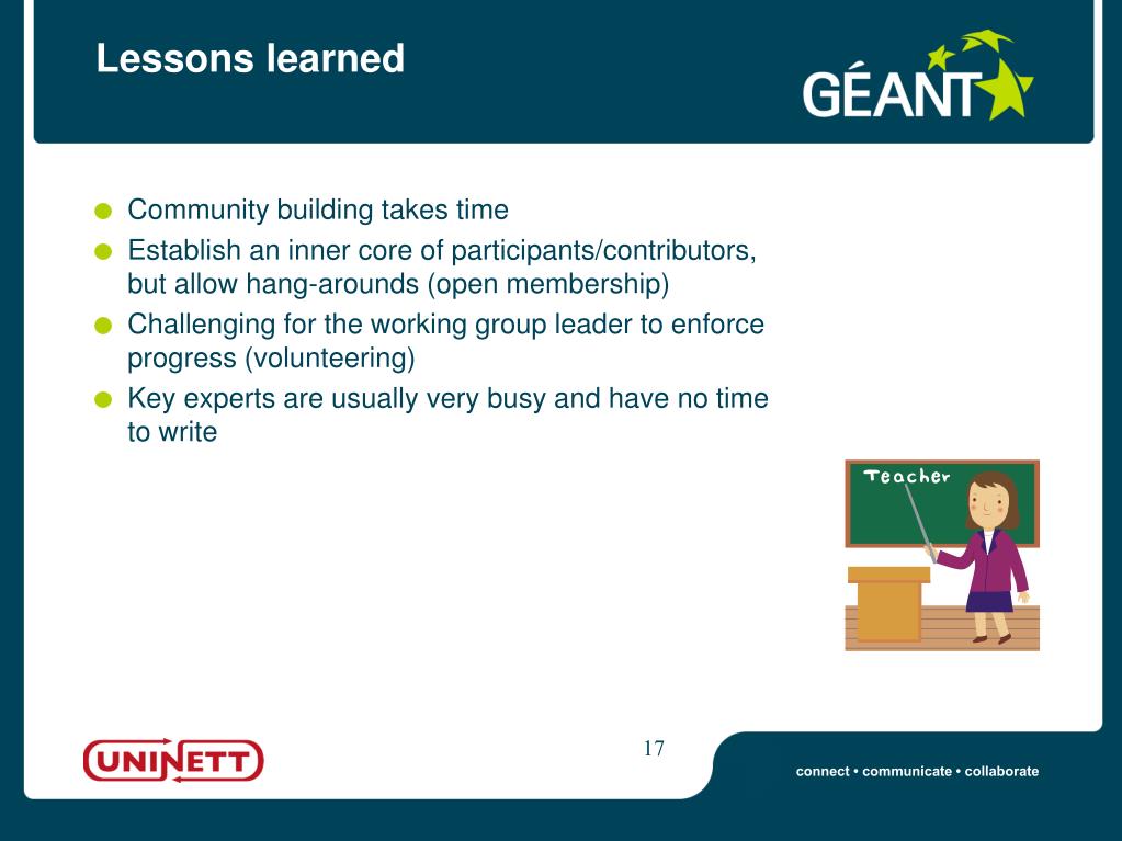 Lessons learned • Initially the NREN should pick best-practice topics. • Draft best-practice documents should be prepared in advance of meetings for best discussion. • Do not write textbooks. • The working group meeting settings are highly valuable for informal talks and discussions on related topics.