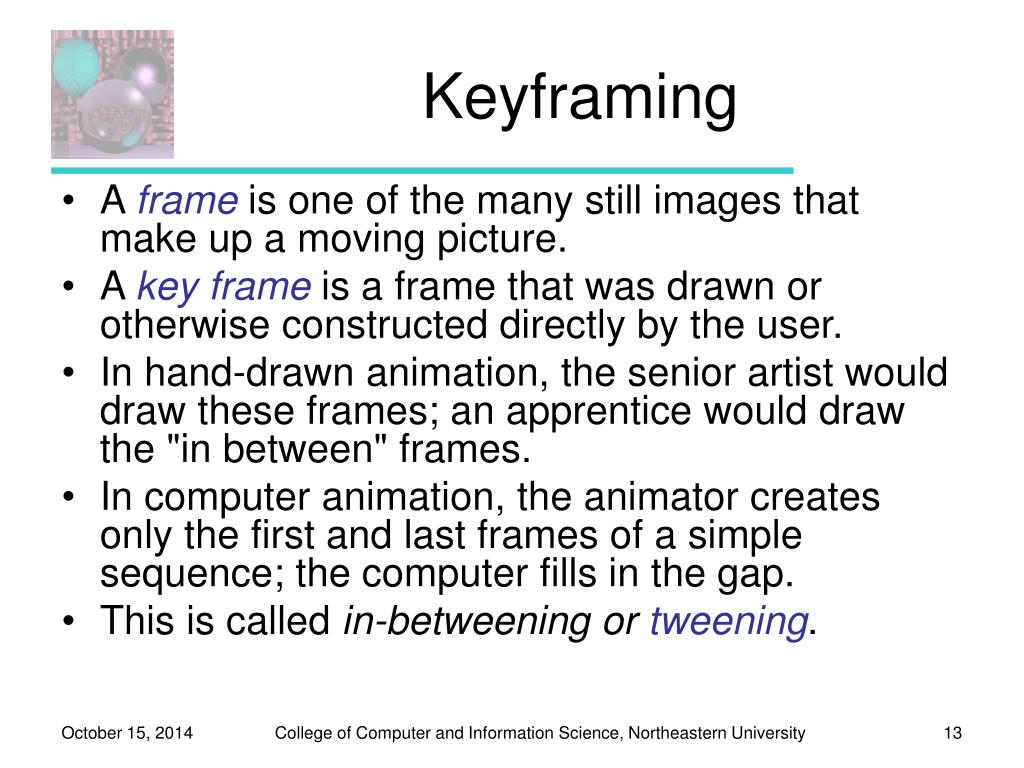 Keyframing • A frameis one of the many still images that make up a moving picture. • A key frame is a frame that was drawn or otherwise constructed directly by the user. • In hand-drawn animation, the senior artist would draw these frames; an apprentice would draw the "in between" frames. • In computer animation, the animator creates only the first and last frames of a simple sequence; the computer fills in the gap. • This is called in-betweening or tweening.