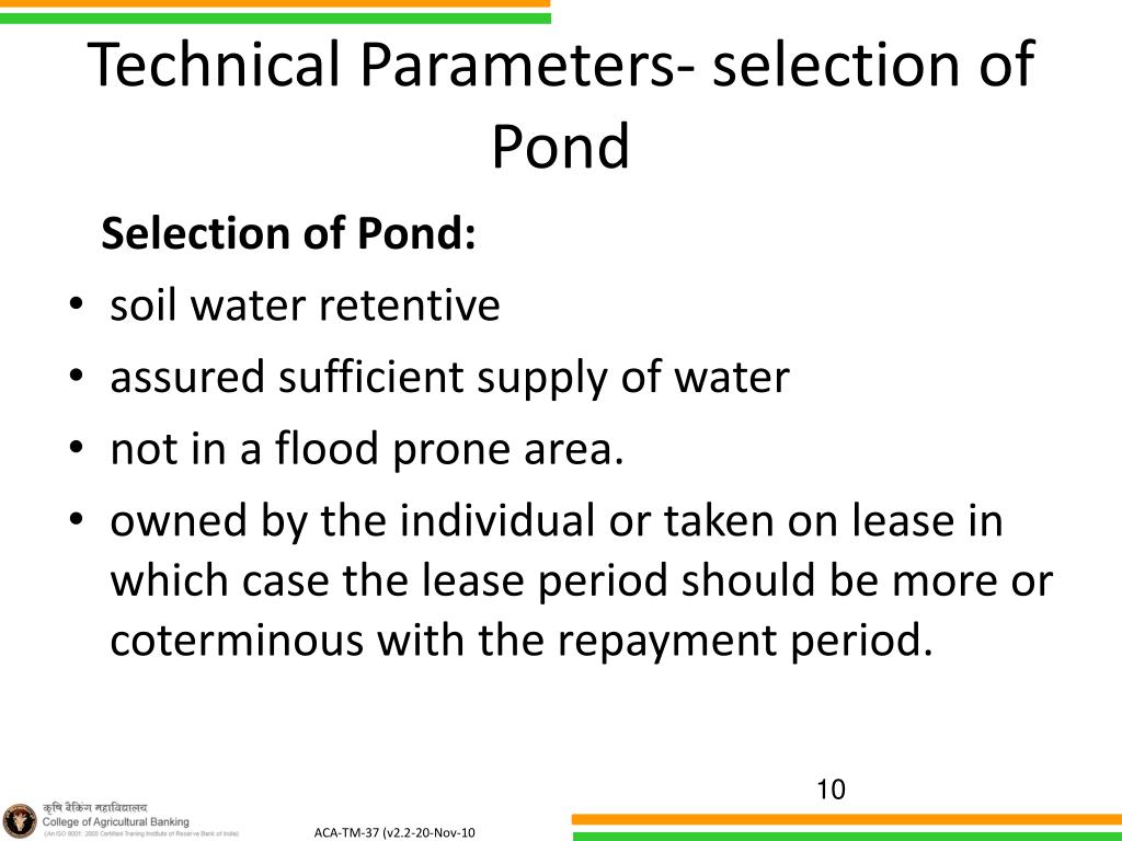 Technical Parameters- selection of Pond Selection of Pond: soil water retentive assured sufficient supply of water not in a flood prone area. owned by the individual or taken on lease in which case the lease period should be more or coterminous with the repayment period.