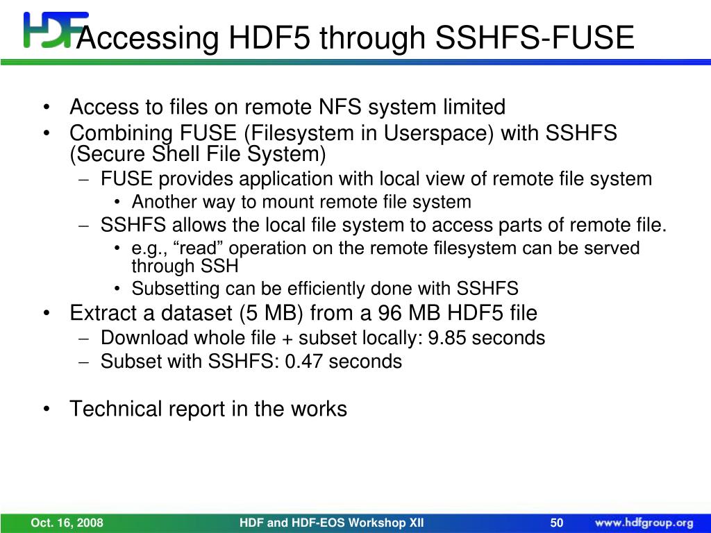 Three “remote access” projects • HDF5-OPeNDAP handler • See talk by Kent Yang: “HDF5 OPeNDAP project update and demo” • HDF5-iRODS integration • See Peter Cao’s talk Thursday: “HDF5 iRODS” • Accessing HDF5 through SSHFS-FUSE HDF and HDF-EOS Workshop XII