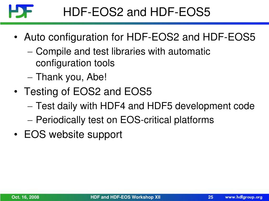 HDF-EOS2 and HDF-EOS5 • Auto configuration for HDF-EOS2 and HDF-EOS5 • Compile and test libraries with automatic configuration tools • Thank you, Abe! • Testing of EOS2 and EOS5 • Test daily with HDF4 and HDF5 development code • Periodically test on EOS-critical platforms • EOS website support HDF and HDF-EOS Workshop XII