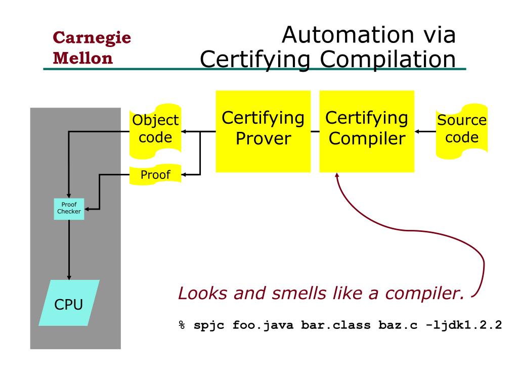 Object code Source code Proof Looks and smells like a compiler. CPU % spjc foo.java bar.class baz.c -ljdk1.2.2 Automation viaCertifying Compilation Certifying Prover Certifying Compiler Proof Checker