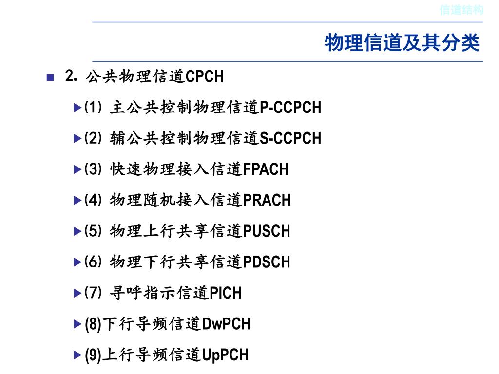 信道结构 物理信道及其分类 • ⒉ 公共物理信道CPCH • ⑴ 主公共控制物理信道P-CCPCH • ⑵ 辅公共控制物理信道S-CCPCH • ⑶ 快速物理接入信道FPACH • ⑷ 物理随机接入信道PRACH • ⑸ 物理上行共享信道PUSCH • ⑹ 物理下行共享信道PDSCH • ⑺ 寻呼指示信道PICH • (8)下行导频信道DwPCH • (9)上行导频信道UpPCH