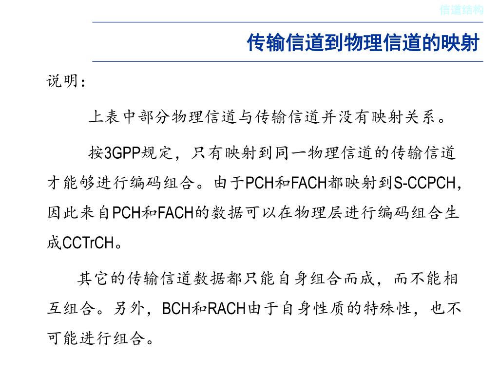 说明: 上表中部分物理信道与传输信道并没有映射关系。 按3GPP规定,只有映射到同一物理信道的传输信道才能够进行编码组合。由于PCH和FACH都映射到S-CCPCH,因此来自PCH和FACH的数据可以在物理层进行编码组合生成CCTrCH。 其它的传输信道数据都只能自身组合而成,而不能相互组合。另外,BCH和RACH由于自身性质的特殊性,也不可能进行组合。 信道结构 传输信道到物理信道的映射