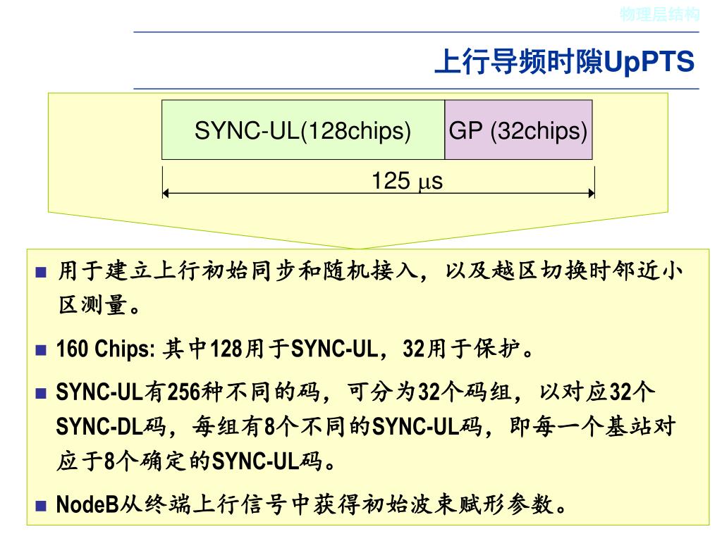 SYNC-UL(128chips) GP (32chips) 125 s 物理层结构 上行导频时隙UpPTS • 用于建立上行初始同步和随机接入,以及越区切换时邻近小区测量。 • 160 Chips: 其中128用于SYNC-UL,32用于保护。 • SYNC-UL有256种不同的码,可分为32个码组,以对应32个SYNC-DL码,每组有8个不同的SYNC-UL码,即每一个基站对应于8个确定的SYNC-UL码。 • NodeB从终端上行信号中获得初始波束赋形参数。