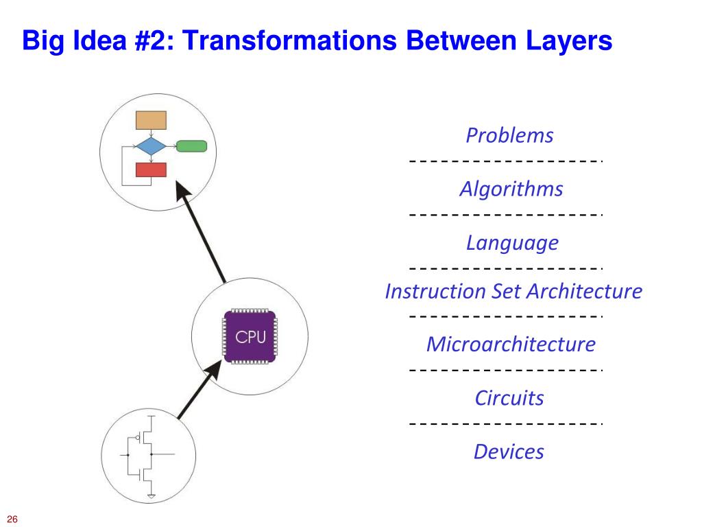 Big Idea #2: Transformations Between Layers Problems Algorithms Language Instruction Set Architecture Microarchitecture Circuits Devices