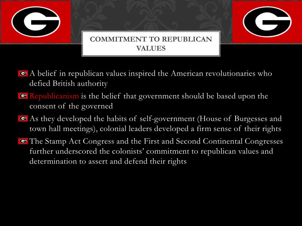Commitment to Republican Values • A belief in republican values inspired the American revolutionaries who defied British authority • Republicanism is the belief that government should be based upon the consent of the governed • As they developed the habits of self-government (House of Burgesses and town hall meetings), colonial leaders developed a firm sense of their rights • The Stamp Act Congress and the First and Second Continental Congresses further underscored the colonists’ commitment to republican values and determination to assert and defend their rights