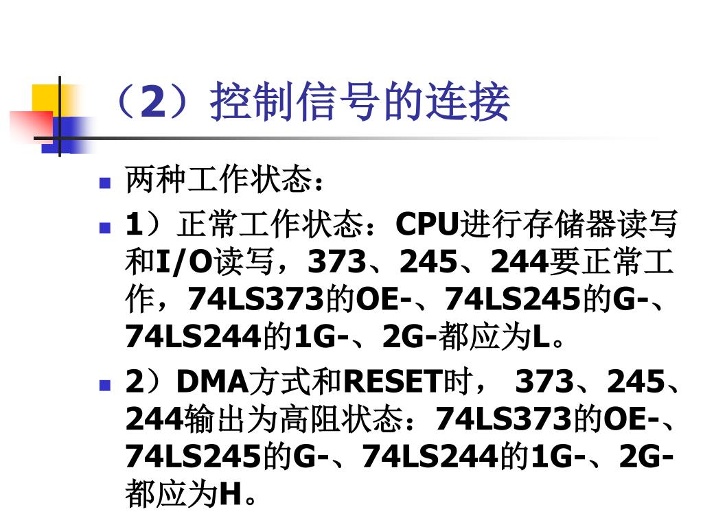 (2)控制信号的连接 • 两种工作状态: • 1)正常工作状态:CPU进行存储器读写和I/O读写,373、245、244要正常工作,74LS373的OE-、74LS245的G-、74LS244的1G-、2G-都应为L。 • 2)DMA方式和RESET时, 373、245、244输出为高阻状态:74LS373的OE-、74LS245的G-、74LS244的1G-、2G-都应为H。