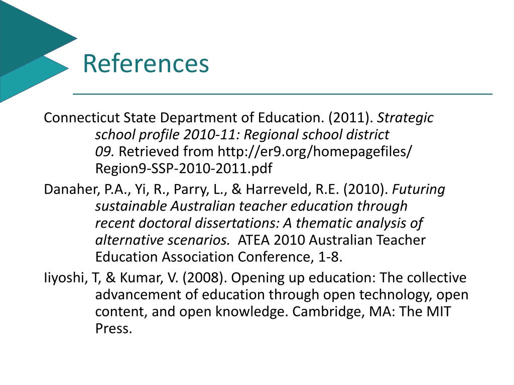 References Connecticut State Department of Education. (2011). Strategic school profile 2010-11: Regional school district 09. Retrieved from http://er9.org/homepagefiles/ Region9-SSP-2010-2011.pdf Danaher, P.A., Yi, R., Parry, L., & Harreveld, R.E. (2010). Futuring sustainable Australian teacher education through recent doctoral dissertations: A thematic analysis of alternative scenarios. ATEA 2010 Australian Teacher Education Association Conference, 1-8. Iiyoshi, T, & Kumar, V. (2008). Opening up education: The collective advancement of education through open technology, open content, and open knowledge. Cambridge, MA: The MIT Press.