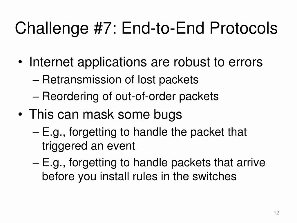 Challenge #7: End-to-End Protocols • Internet applications are robust to errors • Retransmission of lost packets • Reordering of out-of-order packets • This can mask some bugs • E.g., forgetting to handle the packet that triggered an event • E.g., forgetting to handle packets that arrive before you install rules in the switches