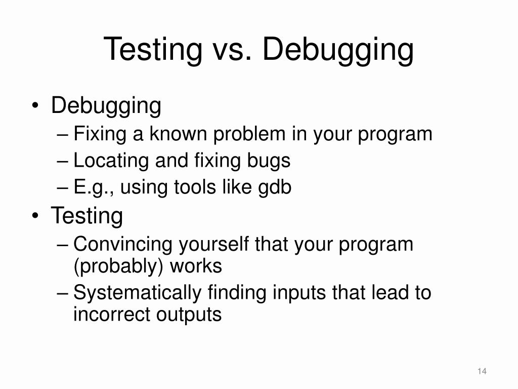 Testing vs. Debugging • Debugging • Fixing a known problem in your program • Locating and fixing bugs • E.g., using tools like gdb • Testing • Convincing yourself that your program (probably) works • Systematically finding inputs that lead to incorrect outputs