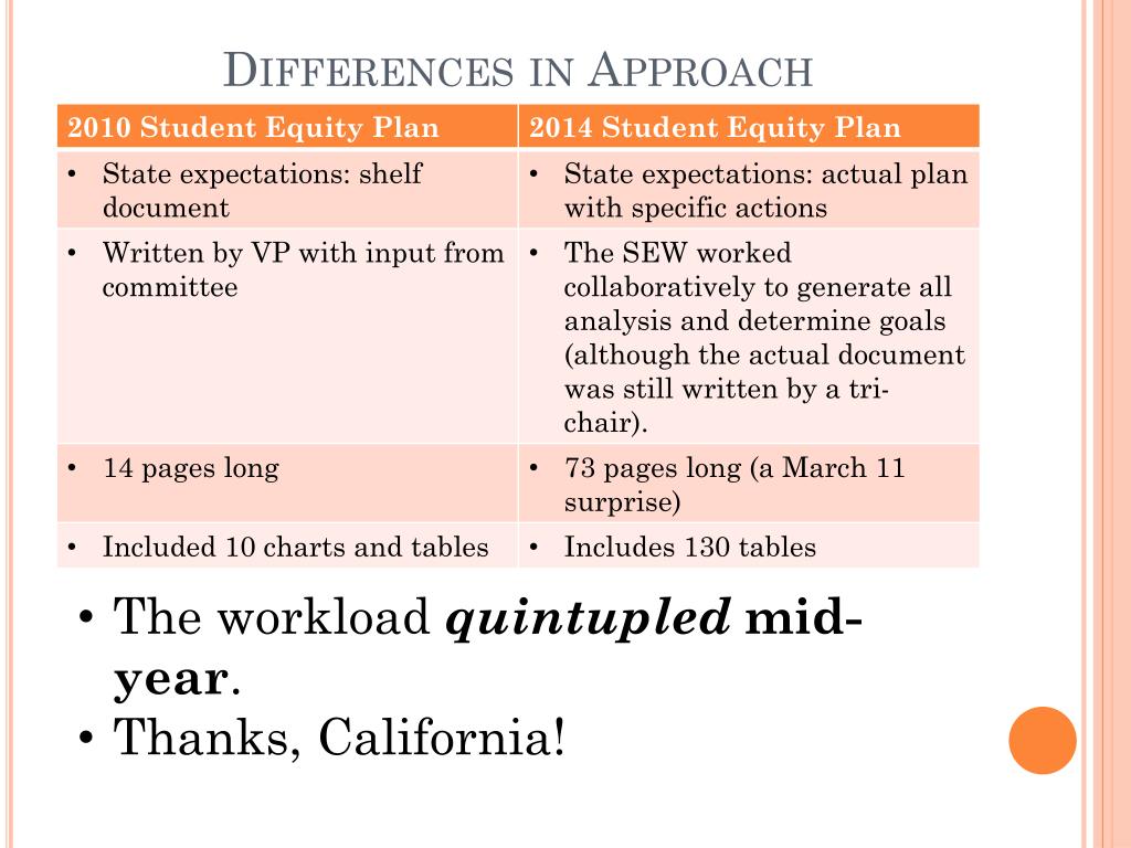 Differences in Approach • The workload quintupledmid-year. • Thanks, California!