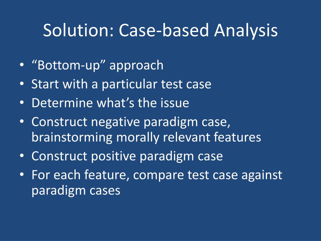 Solution: Case-based Analysis • “Bottom-up” approach • Start with a particular test case • Determine what’s the issue • Construct negative paradigm case, brainstorming morally relevant features • Construct positive paradigm case • For each feature, compare test case against paradigm cases