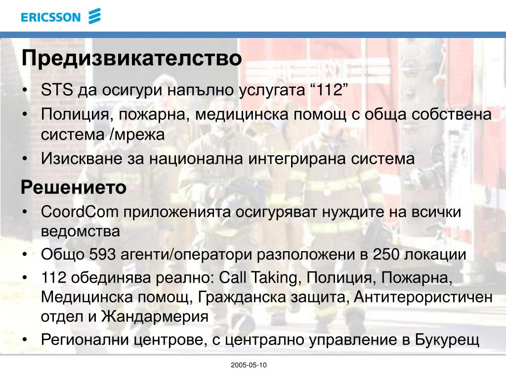 Предизвикателство • STS да осигури напълно услугата “112” • Полиция, пожарна, медицинска помощ с обща собствена система /мрежа • Изискване за национална интегрирана система Решението • CoordCom приложенията осигуряват нуждите на всички ведомства • Общо 593 агенти/оператори разположени в 250 локации • 112 обединява реално: Call Taking, Полиция, Пожарна, Медицинска помощ, Гражданска защита, Aнтитерористичен отдел и Жандармерия • Регионални центрове, с централно управление в Букурещ