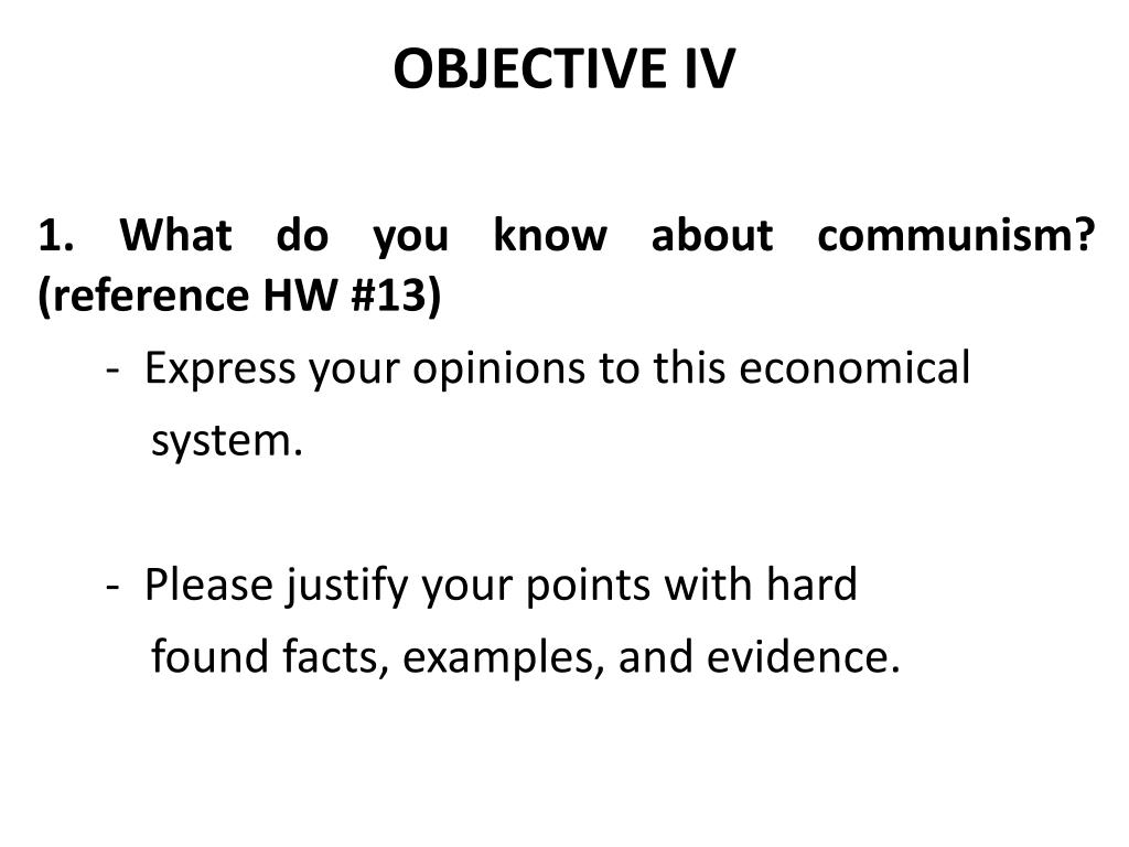 OBJECTIVE IV 1. What do you know about communism? (reference HW #13) - Express your opinions to this economical system. - Please justify your points with hard found facts, examples, and evidence.