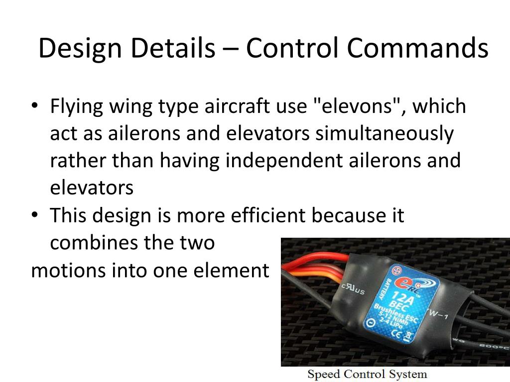 Design Details – Control Commands • Flying wing type aircraft use "elevons", which act as ailerons and elevators simultaneously rather than having independent ailerons and elevators • This design is more efficient because it combines the two motions into one element