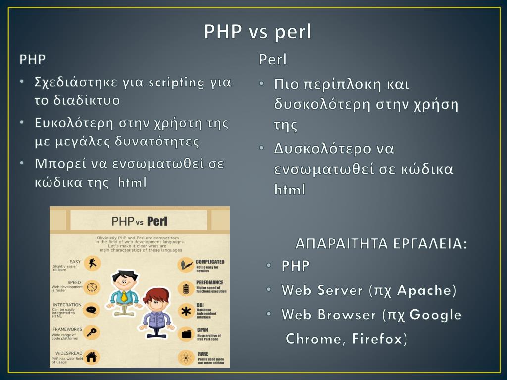 PHP vs perl Perl • Πιο περίπλοκη και δυσκολότερη στην χρήση της • Δυσκολότερο να ενσωματωθεί σε κώδικα html PHP • Σχεδιάστηκε για scripting για το διαδίκτυο • Ευκολότερη στην χρήστη της με μεγάλες δυνατότητες • Μπορεί να ενσωματωθεί σε κώδικα της html ΑΠΑΡΑΙΤΗΤΑ ΕΡΓΑΛΕΙΑ: • PHP • Web Server (πχ Apache) • Web Browser (πχ Google Chrome, Firefox)