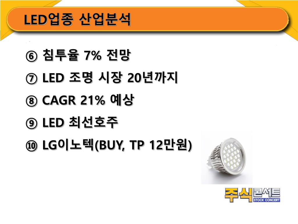 LED업종 산업분석 • 침투율 7% 전망 • LED 조명 시장 20년까지 • CAGR 21% 예상 • LED 최선호주 • LG이노텍(BUY, TP 12만원)