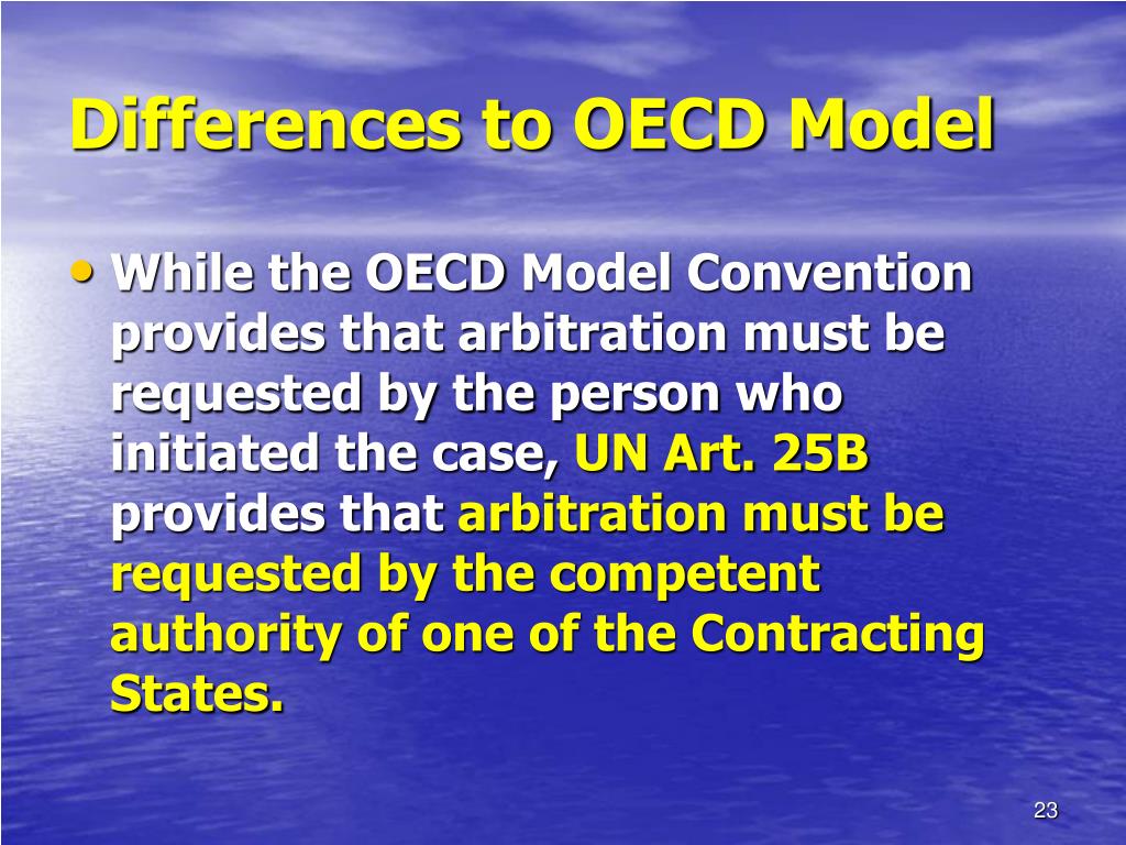 Differences to OECD Model • While the OECD Model Convention provides that arbitration must be requested by the person who initiated the case, UN Art. 25B provides that arbitration must be requested by the competent authority of one of the Contracting States.