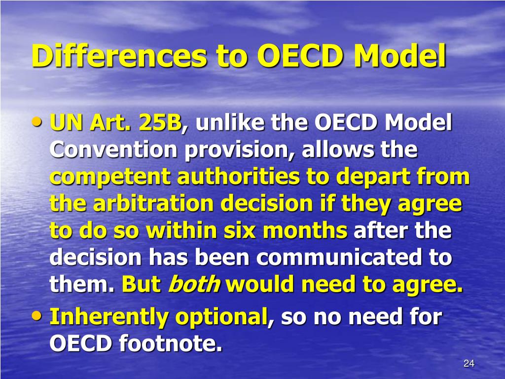 Differences to OECD Model • UN Art. 25B, unlike the OECD Model Convention provision, allows the competent authorities to depart from the arbitration decision if they agree to do so within six months after the decision has been communicated to them. But both would need to agree. • Inherently optional, so no need for OECD footnote.