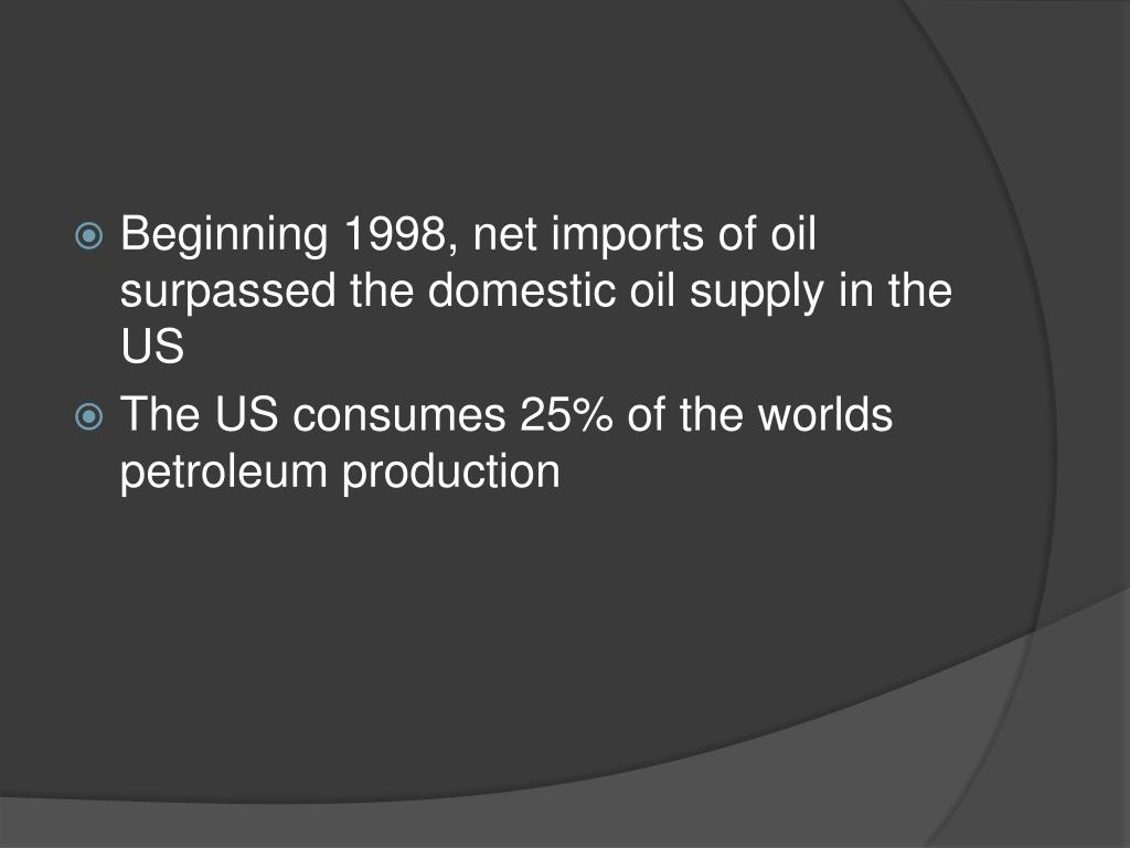 Beginning 1998, net imports of oil surpassed the domestic oil supply in the US • The US consumes 25% of the worlds petroleum production