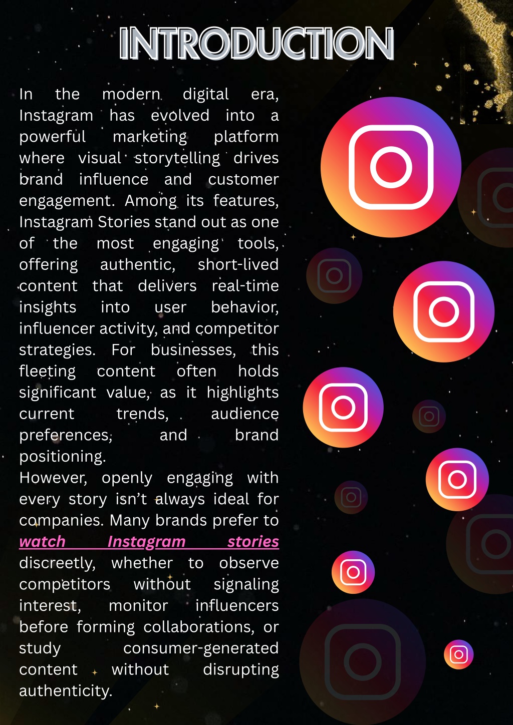 INTRODUCTION INTRODUCTION In Instagram has evolved into a powerful marketing where visual storytelling drives brand influence and customer engagement. Among its features, Instagram Stories stand out as one of the most offering authentic, content that delivers real-time insights into influencer activity, and competitor strategies. For businesses, this fleeting content significant value, as it highlights current trends, preferences, positioning. However, openly engaging with every story isn’t always ideal for companies. Many brands prefer to watch Instagram discreetly, whether to observe competitors without interest, monitor before forming collaborations, or study consumer-generated content without authenticity. the modern digital era, platform engaging tools, short-lived user behavior, often holds audience brand and stories signaling influencers disrupting