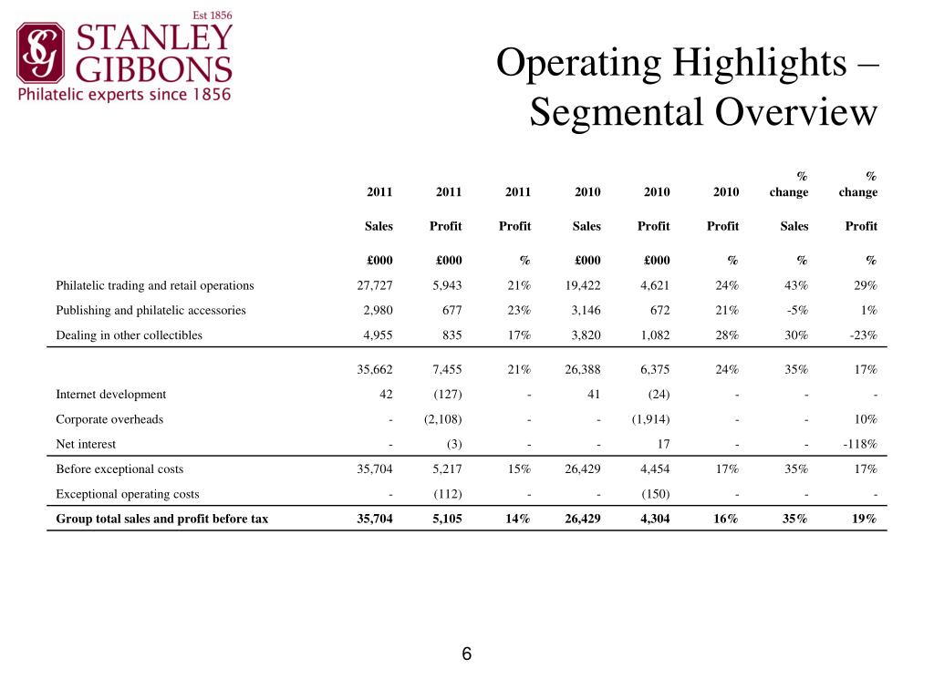 Financial Highlights • Sales up 35% with key growth areas being online trading, philatelic dealing and investment services • Online sales of £4.3m (2010: £2.5m) up 72% • The Benham Group acquisition, completed in September 2010, contributed sales of £2.6m. Like-for-like sales, excluding Benham, were up 28% • Gross margin% down from 43.8% to 38.7% reflecting substantial change in sales mix with an increase in the sale of high value rarities at lower trading spreads • Profit before tax of £5.1m (2010: £4.3m) up 19% • Proposed final dividend of 3.5p (2010: 3.25p), giving a total dividend for the year of 6p (2010: 5.5p), up 9% 4