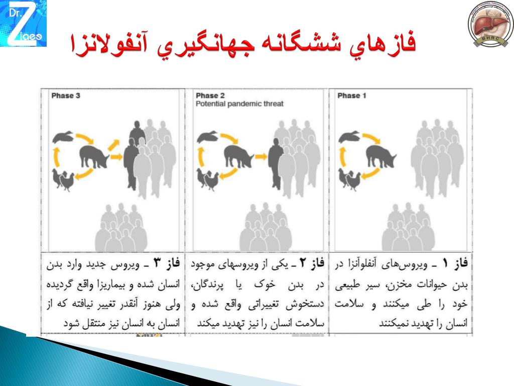سازمان جهانی بهداشت ,سطح فاز5-6 پاندمی فاز4 فاز1-3 بعد از اوج فازهای همه گیری جهانی آنفلوانزا بعد از پاندمی زمان درگیری اغلب در حیوانات ودرگیری محدود انسانی فعالیت بیماری محدود به برخی فصول عفونت گسترده انسانها احتمال رخدادهای راجعه انتقال مداوم انسان به انسان