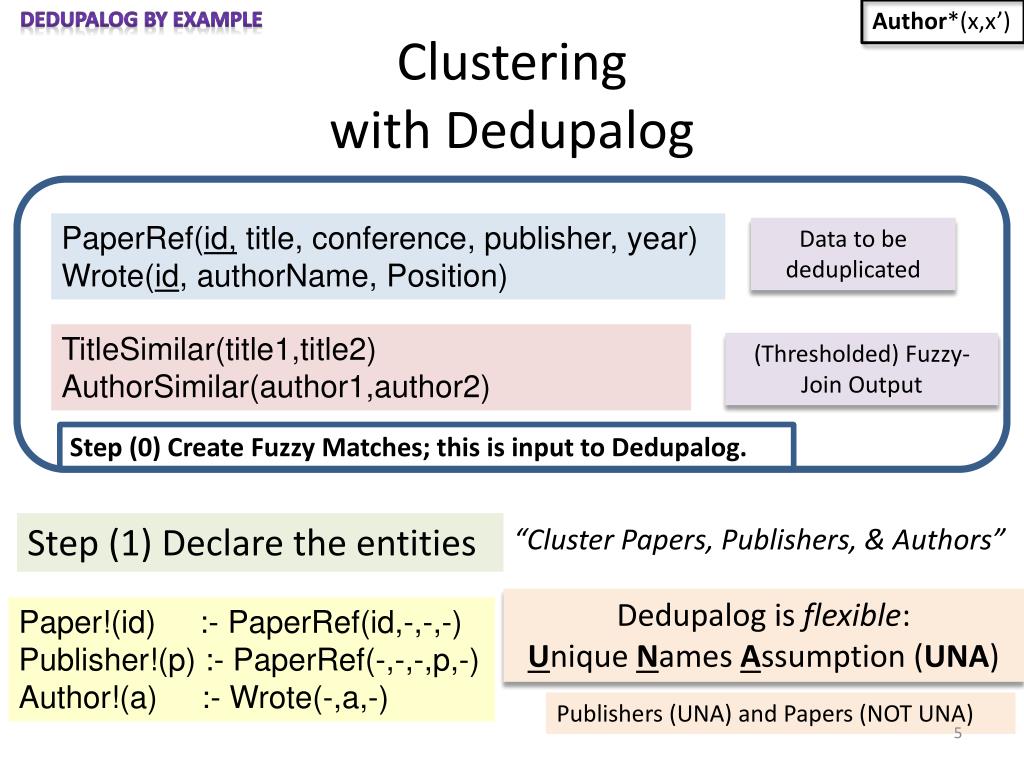 Dedupalog by example Clusteringwith Dedupalog Author*(x,x’) PaperRef(id, title, conference, publisher, year) Wrote(id, authorName, Position) Data to be deduplicated TitleSimilar(title1,title2) AuthorSimilar(author1,author2) (Thresholded) Fuzzy-Join Output Step (0) Create Fuzzy Matches; this is input to Dedupalog. Step (1) Declare the entities “Cluster Papers, Publishers, & Authors” Dedupalog is flexible: Unique Names Assumption (UNA) Paper!(id) :- PaperRef(id,-,-,-) Publisher!(p) :- PaperRef(-,-,-,p,-) Author!(a) :- Wrote(-,a,-) Publishers (UNA) and Papers (NOT UNA)