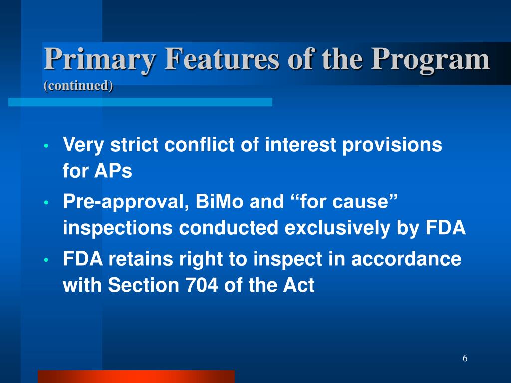 Primary Features of the Program (continued) • Very strict conflict of interest provisions for APs • Pre-approval, BiMo and “for cause” inspections conducted exclusively by FDA • FDA retains right to inspect in accordance with Section 704 of the Act