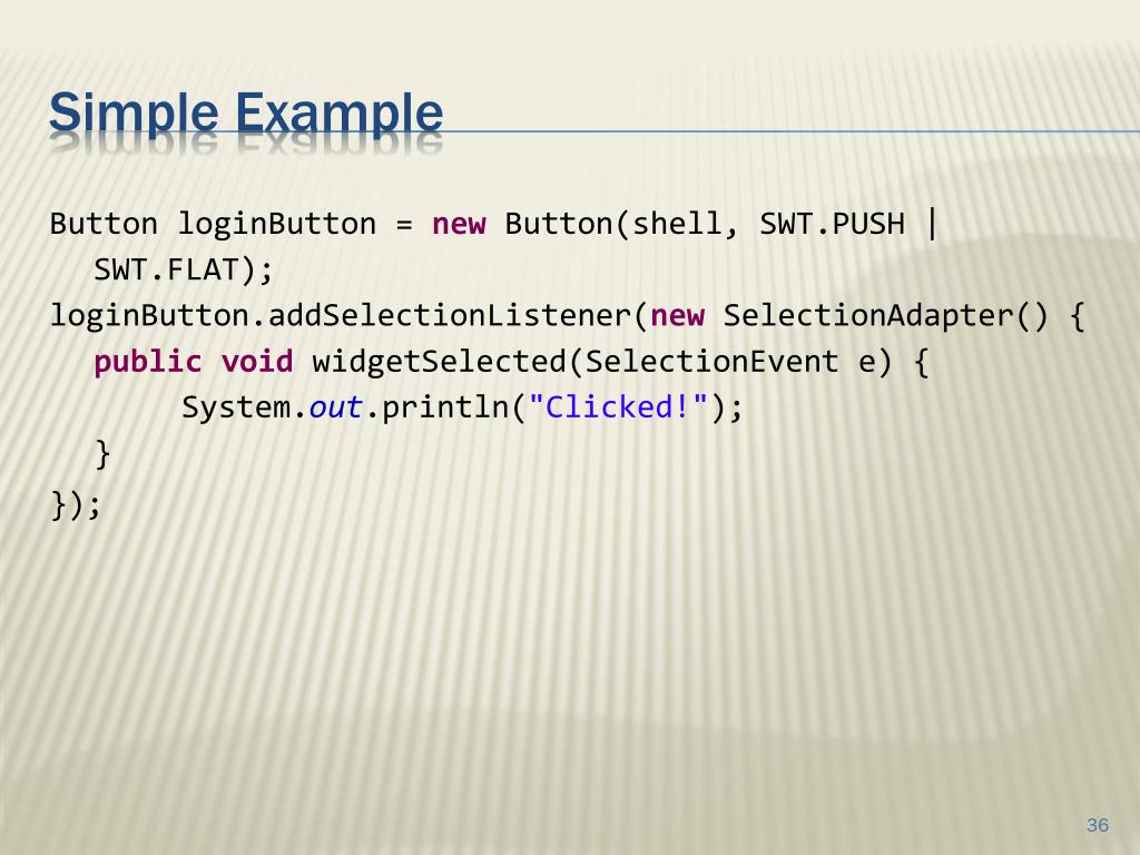 Button loginButton = new Button(shell, SWT.PUSH | SWT.FLAT); loginButton.addSelectionListener(new SelectionAdapter() { publicvoid widgetSelected(SelectionEvent e) { System.out.println("Clicked!"); } }); Simple Example