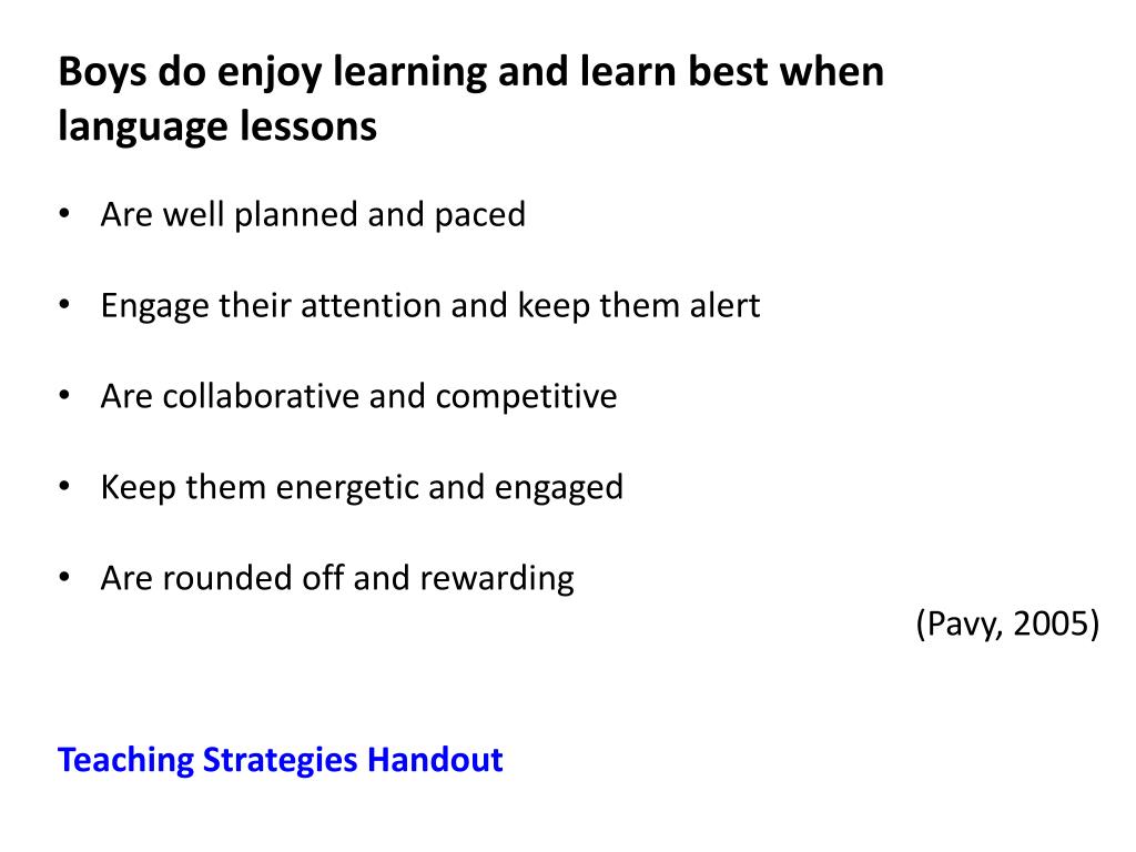 Are well planned and paced • Engage their attention and keep them alert • Are collaborative and competitive • Keep them energetic and engaged • Are rounded off and rewarding • (Pavy, 2005) • Teaching Strategies Handout Boys do enjoy learning and learn best when language lessons