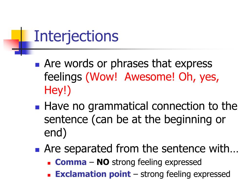 Interjections • Are words or phrases that express feelings (Wow! Awesome! Oh, yes, Hey!) • Have no grammatical connection to the sentence (can be at the beginning or end) • Are separated from the sentence with… • Comma – NO strong feeling expressed • Exclamation point – strong feeling expressed
