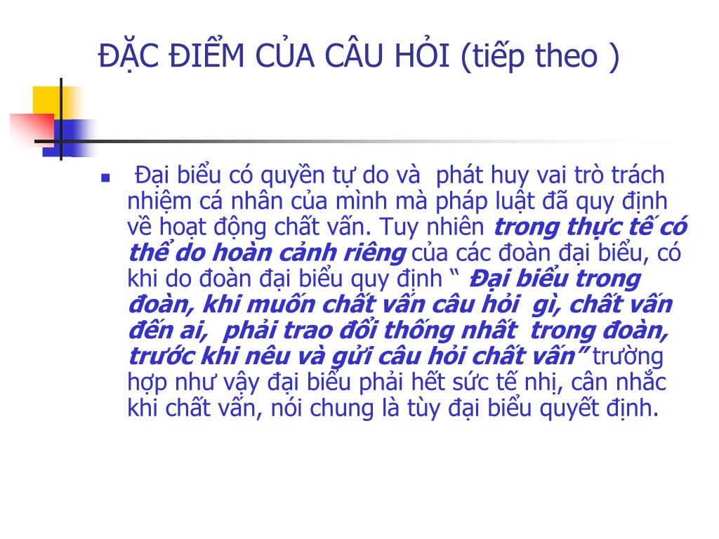 ĐẶC ĐIỂM CỦA CÂU HỎI (tiếp theo ) • Đại biểu có quyền tự do và phát huy vai trò trách nhiệm cá nhân của mình mà pháp luật đã quy định về hoạt động chất vấn. Tuy nhiên trong thực tế có thể do hoàn cảnh riêng của các đoàn đại biểu, có khi do đoàn đại biểu quy định “ Đại biểu trong đoàn, khi muốn chất vấn câu hỏi gì, chất vấn đến ai, phải trao đổi thống nhất trong đoàn, trước khi nêu và gửi câu hỏi chất vấn” trường hợp như vậy đại biểu phải hết sức tế nhị, cân nhắc khi chất vấn, nói chung là tùy đại biểu quyết định.