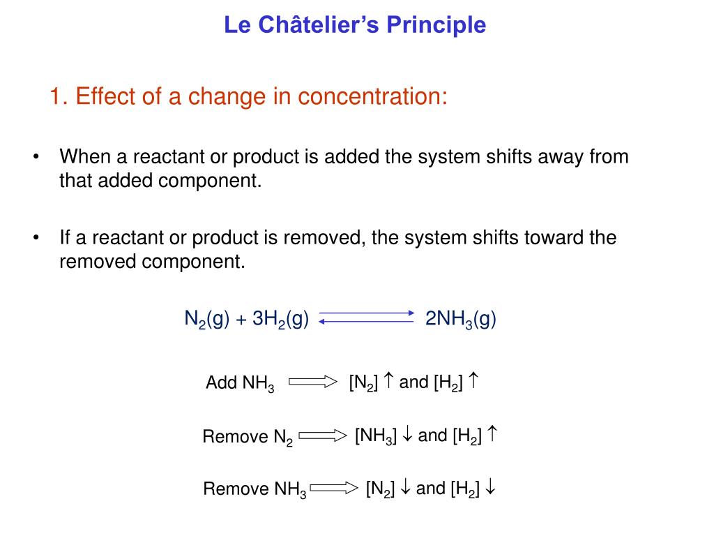 Le Châtelier’s Principle 1. Effect of a change in concentration: • When a reactant or product is added the system shifts away from that added component. • If a reactant or product is removed, the system shifts toward the removed component. N2(g) + 3H2(g) 2NH3(g) [N2] and [H2] Add NH3 [NH3] and [H2] Remove N2 [N2] and [H2] Remove NH3