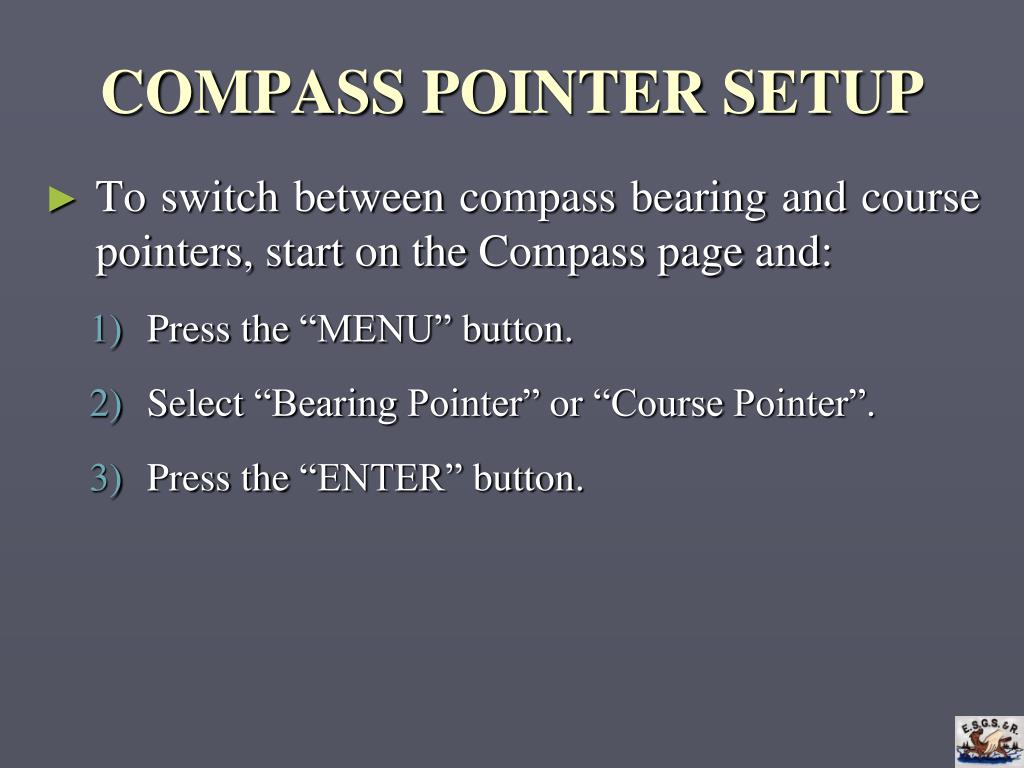 COMPASS POINTER SETUP • To switch between compass bearing and course pointers, start on the Compass page and: • Press the “MENU” button. • Select “Bearing Pointer” or “Course Pointer”. • Press the “ENTER” button.